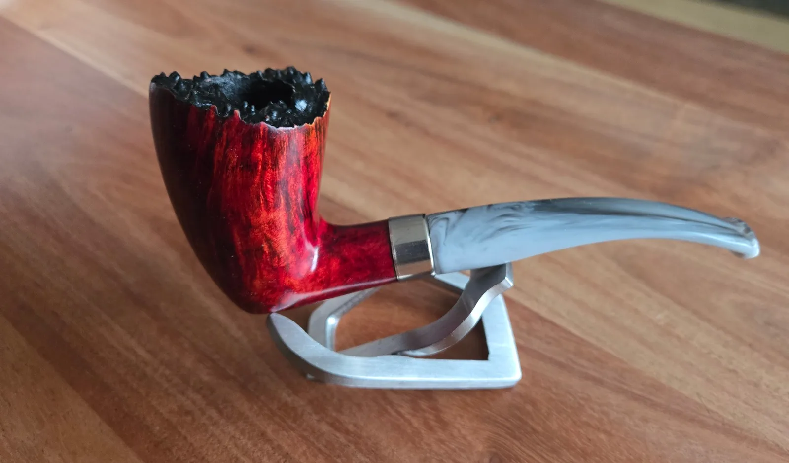 Our first entry in the 'comfy flannel' series, this pipe features the warm, contrasting colors found in Vermont's essential outwear: The Flannel! This pipe features a black and burgundy contracts stain, silver and grey acrylic stem, and a fumed-style plateau rim.