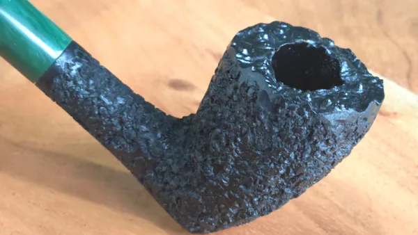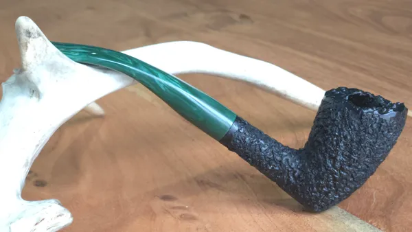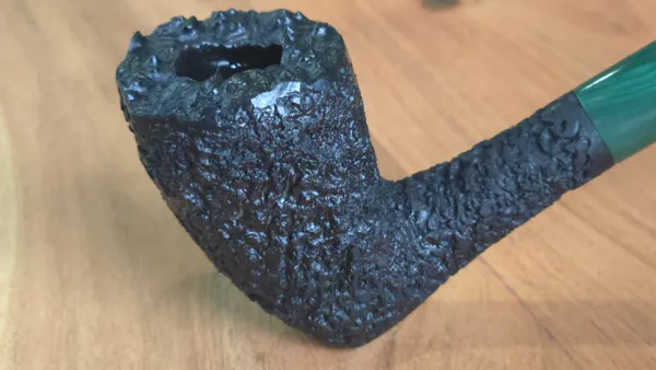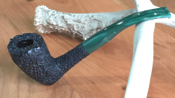 Finished in a craggy black rustication with a malachite-colored stem, this Dublin stretches out at a total length of 6.5 inches. The deep rustication gives way to a plateau rim. Weighing less than 2 ounces, the pipe hangs comfortably without straining the jaw. Price includes shipping.