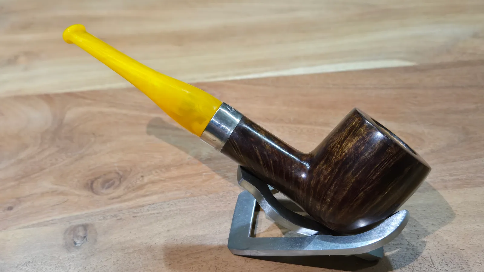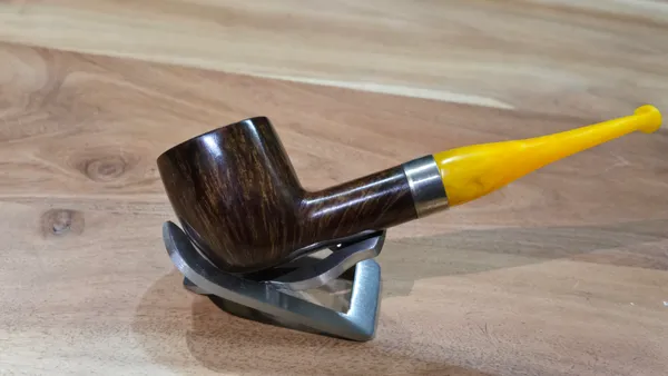 This straight pot maintains the definitive measurements for a classic pot shape, featuring thick walls, a large chamber, and a slightly forward canted bowl. This piece is finished in a contrast stain with sterling silver band and a sunburst stem.